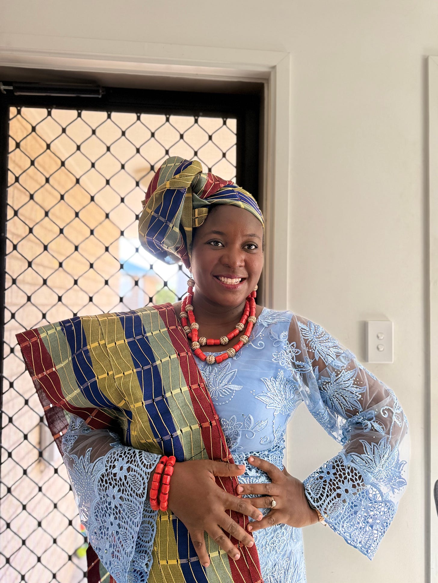 Photo Description: Timi wearing the Yoruba Iro and Buba in powder blue colour sewn from a sheer lace fabric. She has the Jawu style Aso-Oke adorned on her head and across her arm. The Yoruba people call that 'Ipele'.
